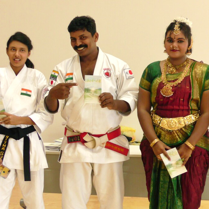 「しあわせへの道」日本チームは、参加している世界中の選手と先生たちに小冊子を提供しました。 小冊子は親や一般の人々、沖縄の地域社会にも提供されました。その目的は、彼らの真の空手道追求を助けることでした。